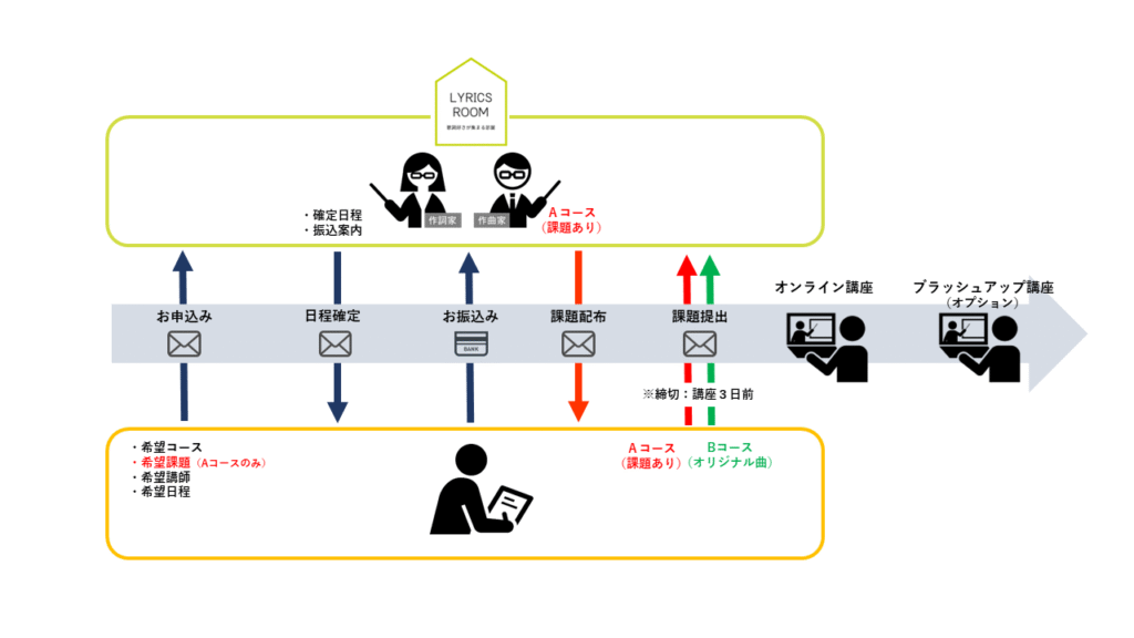 リリックルーム宛に、希望コース、講師(Aコースの場合は課題も)、希望日程をお送り下さい。